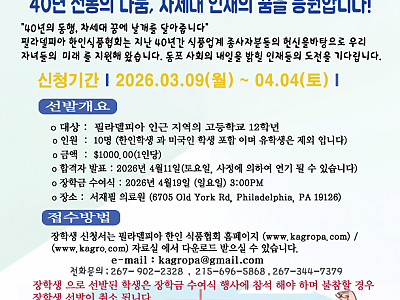 2026년 필라델피아 한인 식품 협회 장학생 모집 공고 [이 게시물은 KAGRO님에 의해 2026-02-26 16:29:58 협회뉴스에서 이동 됨]